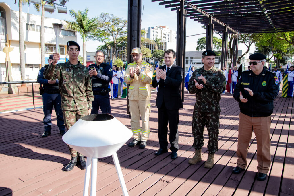 A Semana da Pátria foi aberta nesta sexta-feira (01/09), em ato realizado no platô da Praça Rui Barbosa. Além do hasteamento das bandeiras municipal, estadual e nacional, o ato contou também com a condução do fogo simbólico e o acendimento da pira.