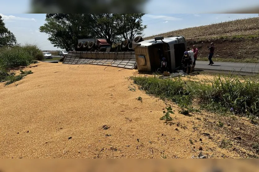 Uma carreta com placas de Santa Catarina carregado com milho tombou na Rodovia PR-082 no incido da tarde desta quinta-feira (21), em São João do Ivaí.