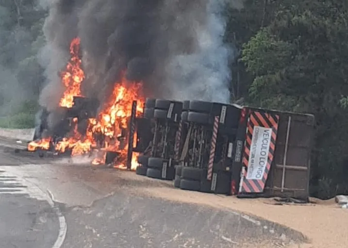 Carreta com soja fica destruída após tombamento e incêndio na BR-376