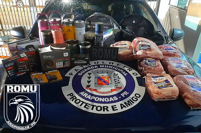 Dois adultos foram presos e dois adolescentes apreendidos após cometerem furtos em comércios da área central de Arapongas na tarde desta segunda-feira (13). Eles são suspeitos de furtarem carnes e diversos outros itens, como lata de tinta spray, eletrônicos, cadeados e outras utensílios de lojas da cidade.