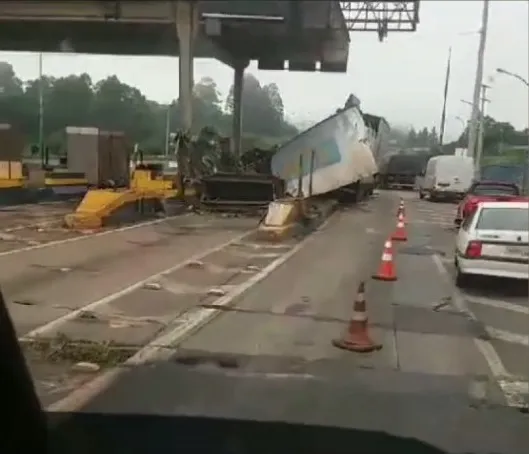 Com a batida, duas cabines do pedágio foram destruídas. O acidente ocorreu em meio a condições de neblina na região, e o tráfego segue lento no local neste momento.
