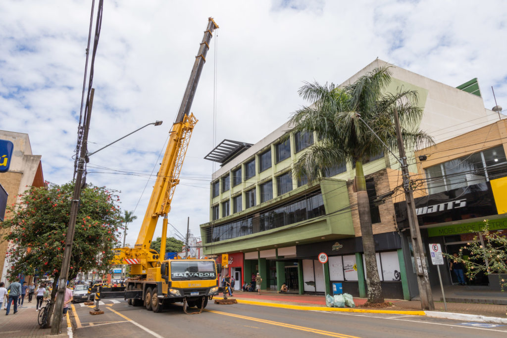 Uma grande operação, envolvendo a interdição do trânsito em uma quadra da Avenida Curitiba e a utilização de um guindaste, foi montada para fazer a manutenção do sistema de climatização do Cine Teatro Fênix. O serviço está acontecendo nesta terça-feira (06/12) e envolve a troca de peças das máquinas de ar-condicionado, chamadas de “splitão” e que ficam no pavimento superior.