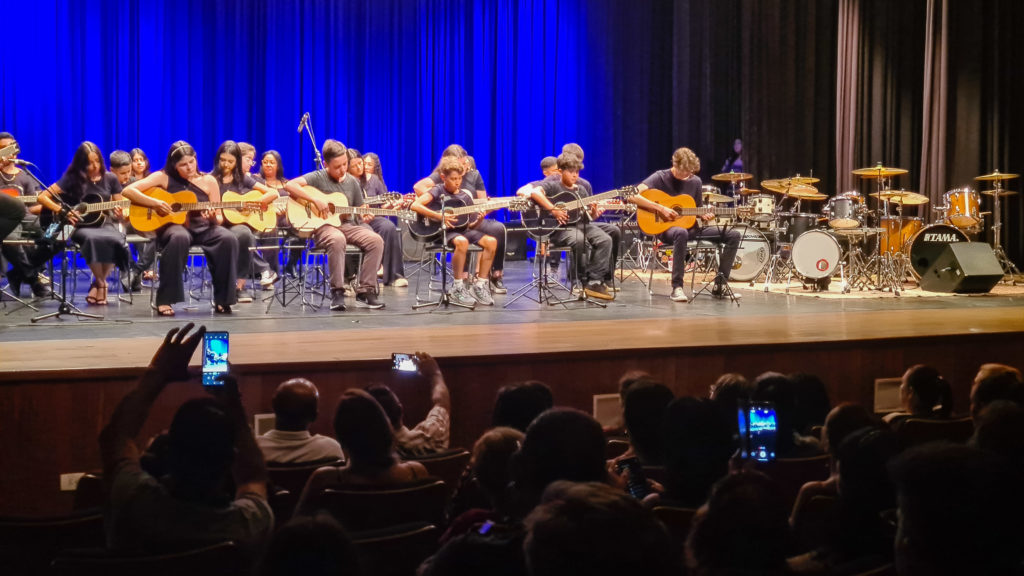 A maioria das músicas ao violão foi acompanhada pelos alunos de bateria da Escola Municipal de Artes. Encerrando a noite, a apresentação foi protagonizada por alunos da bateria, mostrando o quanto já dominam o instrumento.