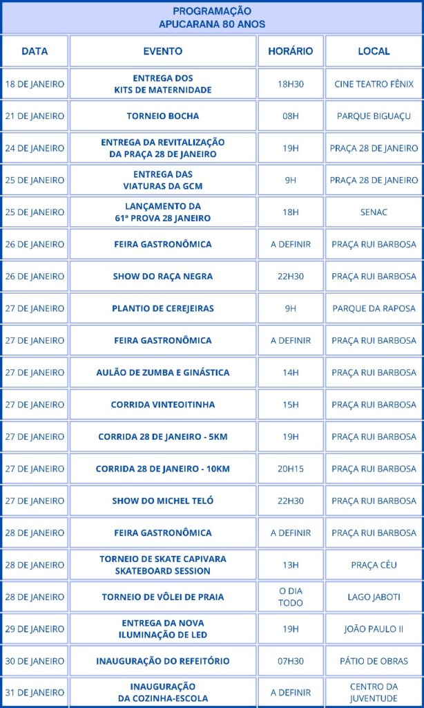 A Prefeitura de Apucarana divulgou nesta quinta-feira (18) a programação completa dos eventos alusivos aos 80 anos de emancipação política e administrativa do município. As principais atrações são a tradicional Prova Pedestre 28 de Janeiro, que será realizada no sábado, dia 27, a partir 15 horas (vinteoitinha), às 19 horas (5 km) e 20h30 (10 km); a entrega da revitalização da Praça Semiramis Braga (Praça 28 de Janeiro), no dia 24 de janeiro, às 19 horas, com show da Banda do Exército Brasileiro; e os shows musicais com o grupo Raça Negra, no dia 26, às 22h30; e do cantor Michel Teló, no dia 27 de janeiro, também às 22h30.