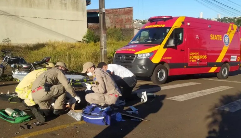 Um motociclista teve ferimentos graves e moto danificada após colidir em um carro durante a manhã desta quinta-feira (18) em Apucarana. O acidente aconteceu no cruzamento da Rua Higino Sacchelli esquina com a Rua Adail Costa, no bairro Jardim Marissol.