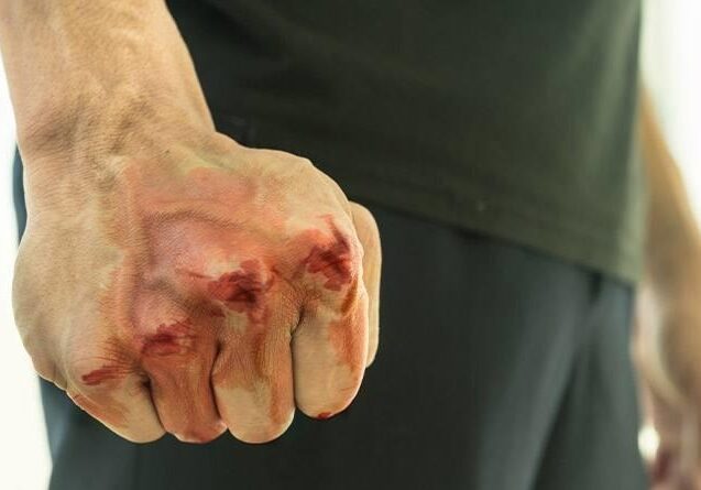 Um homem caído no chão, com o braço aparentemente quebrado e escoriações pelo rosto e corpo. Consciente, relatou ter sido agredido por três homens desconhecidos, os quais não conseguiu descrever.