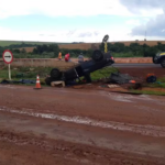 A carga de madeira de eucalipto ficou espalhada pelos dois sentidos da pista, assim como o combustível do veículo.