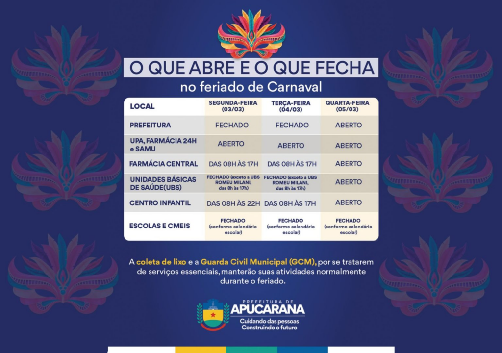 O prefeito Rodolfo Mota assinou o decreto 096/2025 estabelecendo o funcionamento dos órgãos públicos municipais no feriado do Carnaval. A Prefeitura de Apucarana estará fechada nos dias 3 e 4 de março (segunda e terça-feira), retomando as atividades normais na quarta-feira (5 de março), a partir das 8 horas.