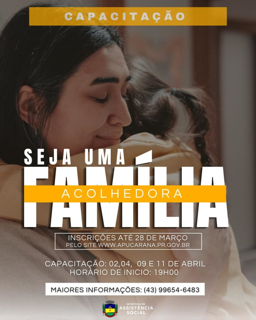 Os voluntários interessados em participar do Programa Família Acolhedora de Crianças e Adolescentes têm até sexta-feira (28/03) para fazerem o cadastramento. Atualmente, cerca de vinte apucaranenses, com idades entre 2 e 17 anos, aguardam em instituições pelo acolhimento. Os interessados devem preencher o formulário, que está disponível no site da Prefeitura de Apucarana.