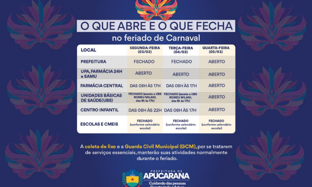 0 215 2 Uncategorized Decreto estabelece funcionamento dos órgãos municipais no feriado de Carnaval by Cayo Silva março 1, 2025 O prefeito Rodolfo Mota assinou o decreto 096/2025 estabelecendo o funcionamento dos órgãos públicos municipais no feriado do Carnaval.... Read More