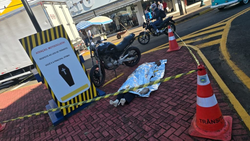 Além de blitz educativa com panfletagem sobre a infração gravíssima do uso do celular durante a direção, a ação que contará com participação de agentes municipais de trânsito, guardas civis e policiais militares também utilizará cenários que simulam ocorrências reais. “Um exemplo é a representação de um acidente fatal envolvendo um motociclista, após batida contra anteparo. Uma situação, infelizmente, que acontece muito no dia a dia”, relata Felipe Augusto Rosa, diretor operacional de Trânsito do Município. Segundo ele, a cena será composta por uma moto, a vítima (boneco) e complementada com uma placa com os dizeres: “Atenção motociclista: respeite a lei de trânsito. Você é a principal vítima!, juntamente com a imagem de uma urna funerária (caixão) na cor preta”.