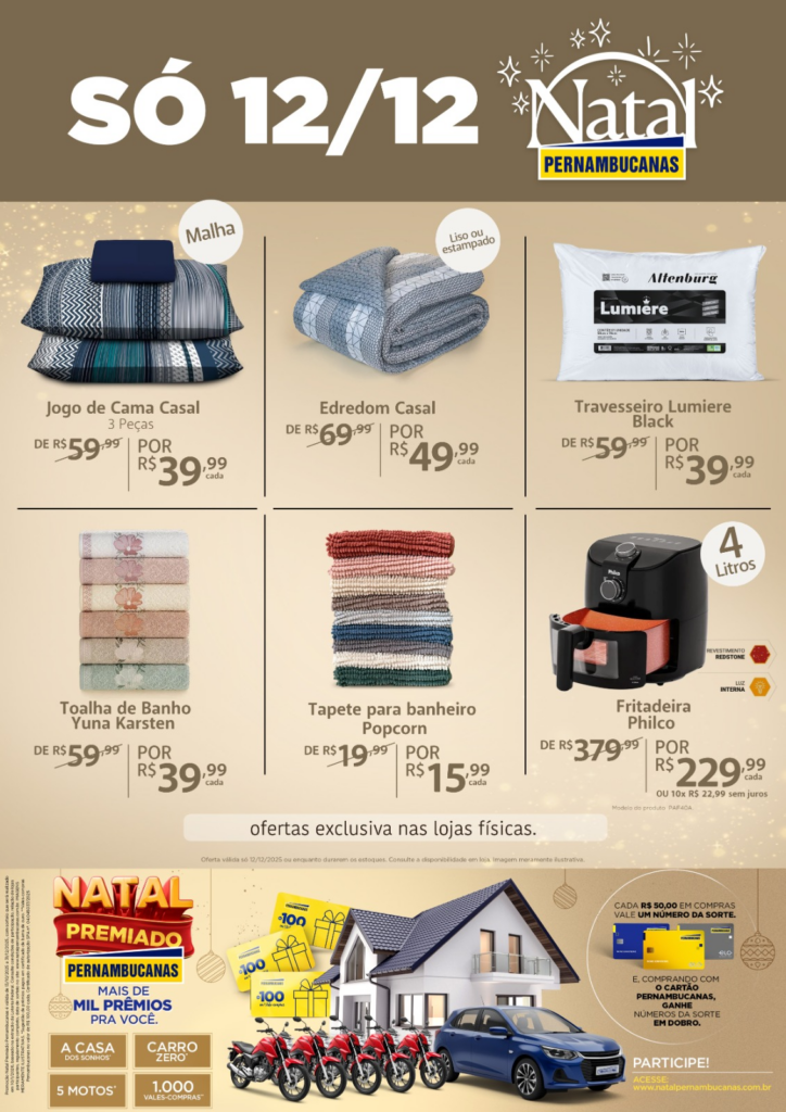 Além das ofertas, a rede apresenta a campanha “Natal Premiado Pernambucanas”, que vai sortear mais de mil prêmios, incluindo uma casa dos sonhos, um carro zero, 5 motos e vale-compras. Cada R$ 50 em compras gera um número da sorte, e clientes usando o Cartão Pernambucanas ganham números em dobro.